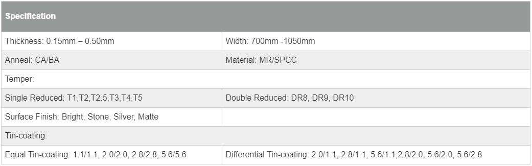 Electrolytic Tinplate (ETP) is a thin cold-rolled carbon steel sheet coated by tin. It has an extremely beautiful metallic luster and excellent properties in corrosion resistance, solderability, and weldability, yet it is non-toxic.
