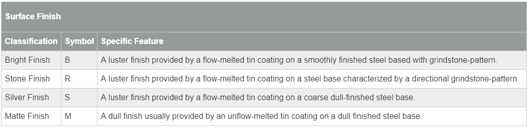 A luster finish provided by a flow-melted tin coating on a coarse dull-finished steel base.
